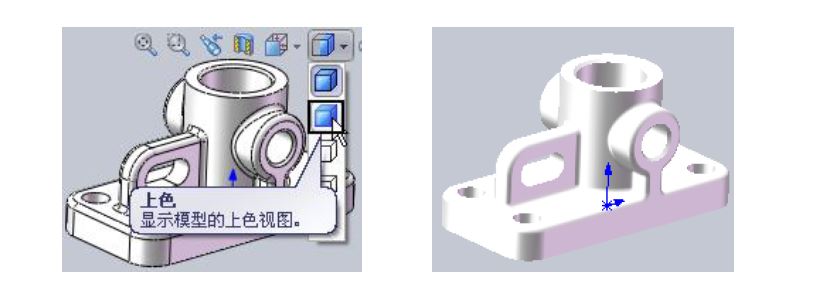 系统默认显示样式为“带边线上色显示”(带线框着色模型),更改模型显示样式为“上色”(着色不显示线框)显示。在图形区域上方命令管理器中,单击“显示样式”命令图标下拉菜单中的“上色”命令图标 ,模型显示为不带线框着色模型状态。
