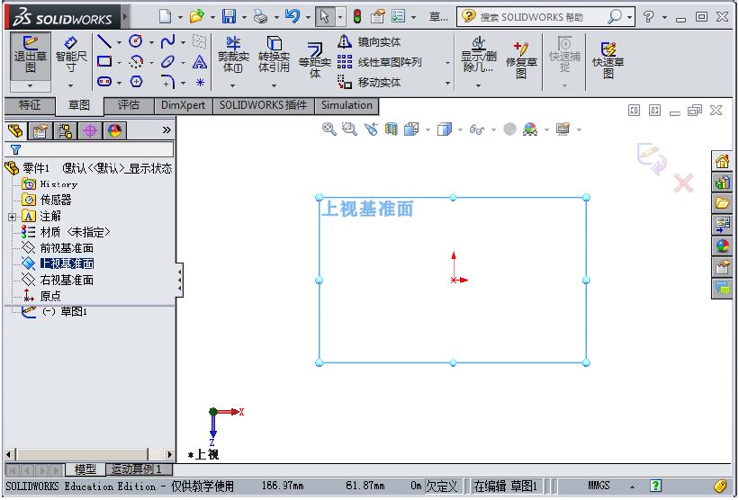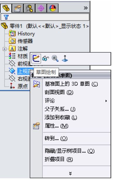 一般来说构建三维模型首先需要构造一个平面的特征,然后通过拉伸等方式让它变成三维的,为此首先需要画一个二维草图。在界面左侧点击上视基准面,点击草图绘制,自动进入二维模式。