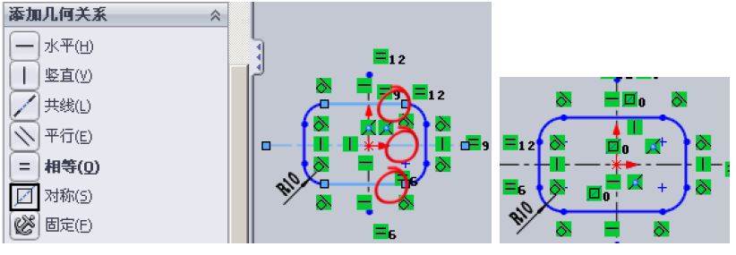 有时在构造图时,需要保证“垂直”、“平行”等几何关系,为此需要添加几何约束。具体操作方式是按住ctrl,并选择对应的图形,在界面左侧出现的“属性”对话框中选择。下图以构造对称矩形为例: