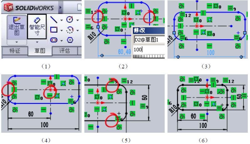 有时候已经给定了尺寸,因此需要通过尺寸标注固定某些边的长度。单击“智能尺寸”命令图标,在草图中依次单击的两条边,在光标处出现两者之间的间距尺寸,向下移动鼠标到合适位置并单击鼠标左键确认尺寸放置位置,在出现的“修改”对话框中输入数值“100”,单击修改对话框中的确 定图标“ ”或直接回车,创建尺寸标注。 下图仍以矩形为例
