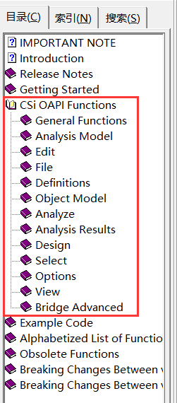 打开OAPI文档(文档在SAP2000安装根目录下,文件名CSI_OAPI_Documentation.chm),点击左边索引菜单中的CSi OAPI Functions栏可以看到各类可供使用的函数,比如Object Model栏中可以查到跟对象操作有关的函数,Select栏中可以查到跟对象的选取有关的函数。在实际使用时就根据需要在左侧索引栏中一层一层找到自己想要的函数。