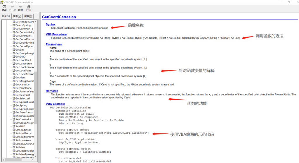 点击某个具体的函数后,在右侧会显示出这个函数有关的信息。Procedure栏中显示函数调用时会输入/获得的变量,Parameters是针对这些变量的解释,Remarks是有关这个函数的说明。以图中选择的SapObject.SapModel.PointObj.GetCoordCartesian为例,这个函数会根据你输入的点的名称(ByVal Name As String),告诉你这个点的三个坐标(x,y,z),图中第五个变量是指要得到这个点在哪个坐标系下的坐标,一般默认在是全局坐标系下的坐标。值得注意的是,OAPI文档里的使用信息都以VBA为例所写,在语法上与C#略有差异。