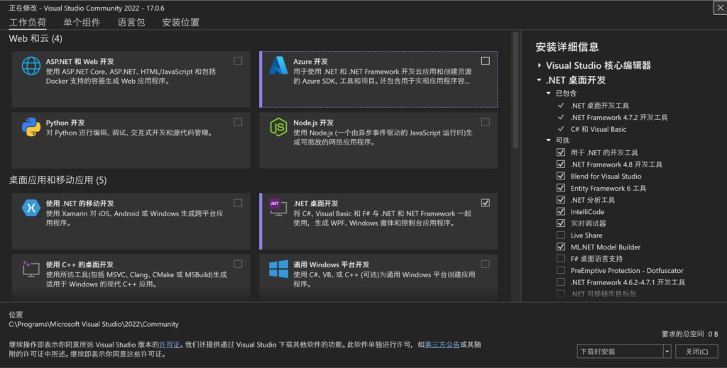 下载 Visual Studio 后,启动下好的安装包,将会为你安装 Visual Studio Installer 方便管理,全流程都是提供简体中文描述的,比较容易理解,整体而言一路下一步即可,注意在如图所示的「工作负载」部分要勾选「.NET 桌面开发」即可。(当然即使忘记了后续也可以通过 Visual Studio Installer 补上,所以放轻松!)