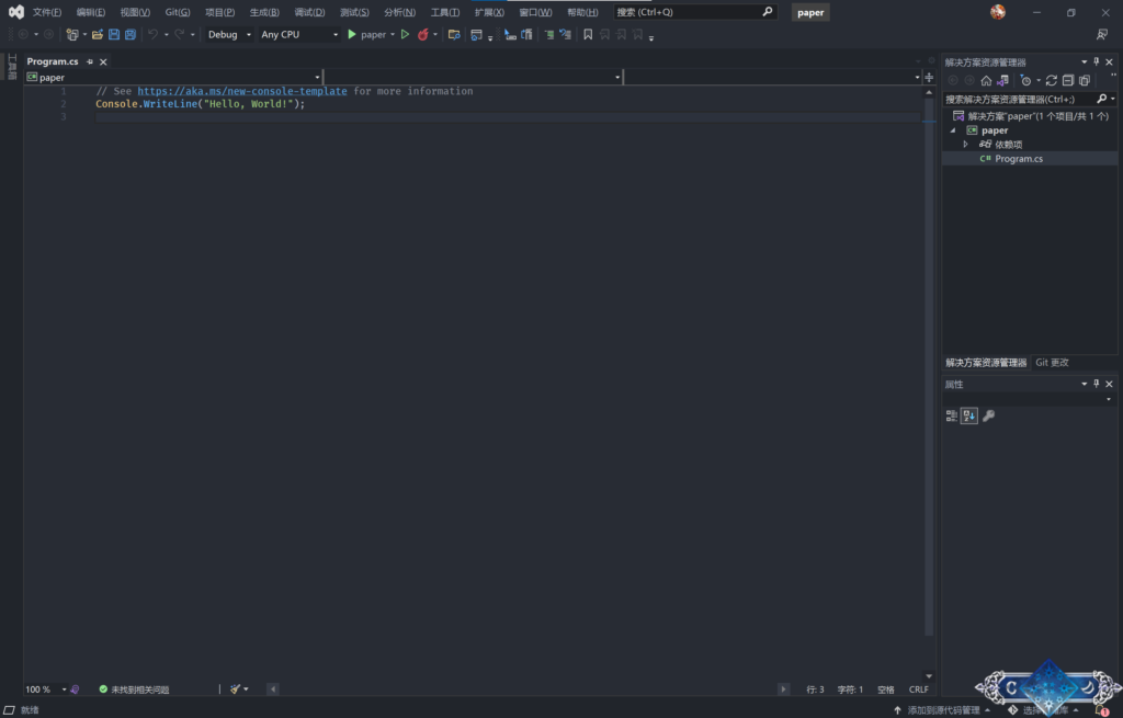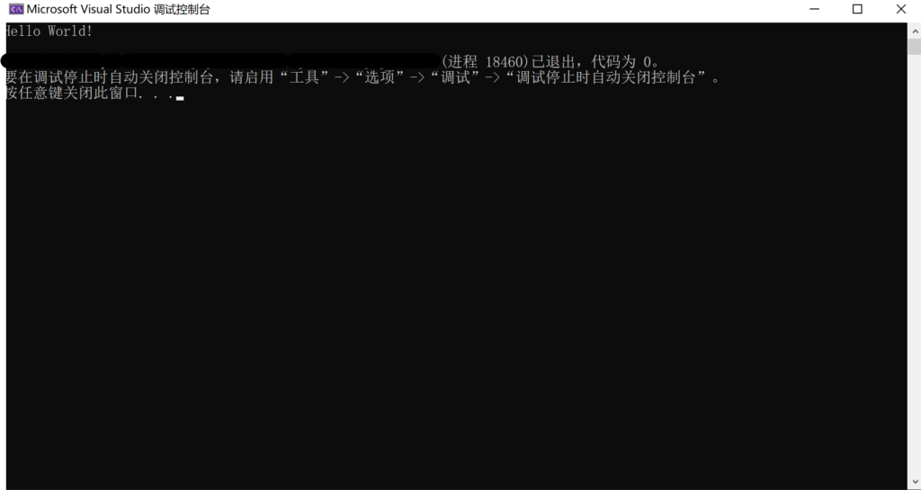如果你和笔者一样使用的是非常新版本的 Visual Studio(比如刚刚下载好的 Visual Studio 2022),在建立新项目之后大概率会见到一个总共两行还有一行是注释的 Hello World! 程序: