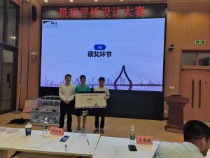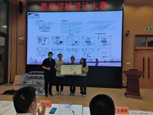 经过激烈的角逐,最终决出特等奖1名,一等奖1名,二等奖3名,三等奖5名。在王海深老师为比赛做总结之后,决赛进入颁奖环节,赛事方先为第一届景观浮桥设计大赛唯一完赛的唐俊甜小组的同学颁发了特别奖项,之后由各位嘉宾为获奖的选手颁奖并合影留念。
